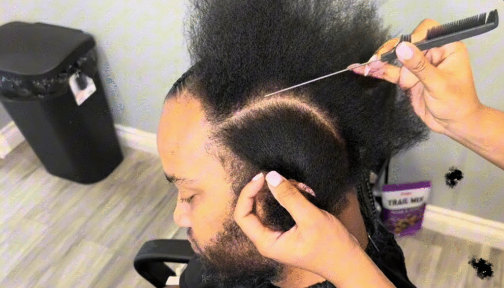 Create a Parting to stitch one side. Divide one side of the hair. hold it and pass the comb through it. Switch the tools and also divide other part the same as the first to create balanced section.